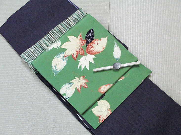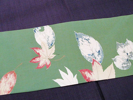 合わせた帯は、もえぎ色に紅葉が配されたものです。
