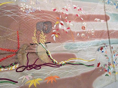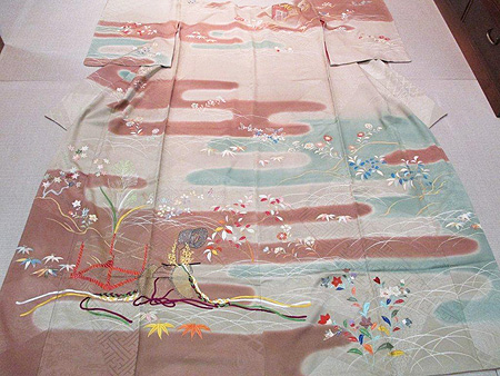秋の図訪問着 華やかな訪問着が入荷しました。 霞がかった静かな秋の野。 残された冠の刺繍が、風情ある景色になっています。 肩には牛車の刺繍、秋の花やススキも彩りよく、雅な趣の訪問着です。胴裏は紅絹。 身丈もある状態の良い商品となっております。 秋の図訪問着 70,000円+税 身丈:4尺2寸(約159.6cm) 裄:1尺7寸5分(約66.5cm) 海老沢
