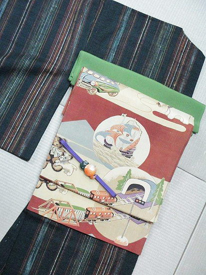 落ち着いたひわだ色に、昔の玩具の絵が描かれたノスタルジック溢れる帯。