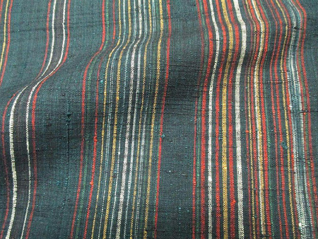 写真の紬は高麗納戸色に朱、黄、緑、薄青、白などがの縞が入った非常に凝ったもの。