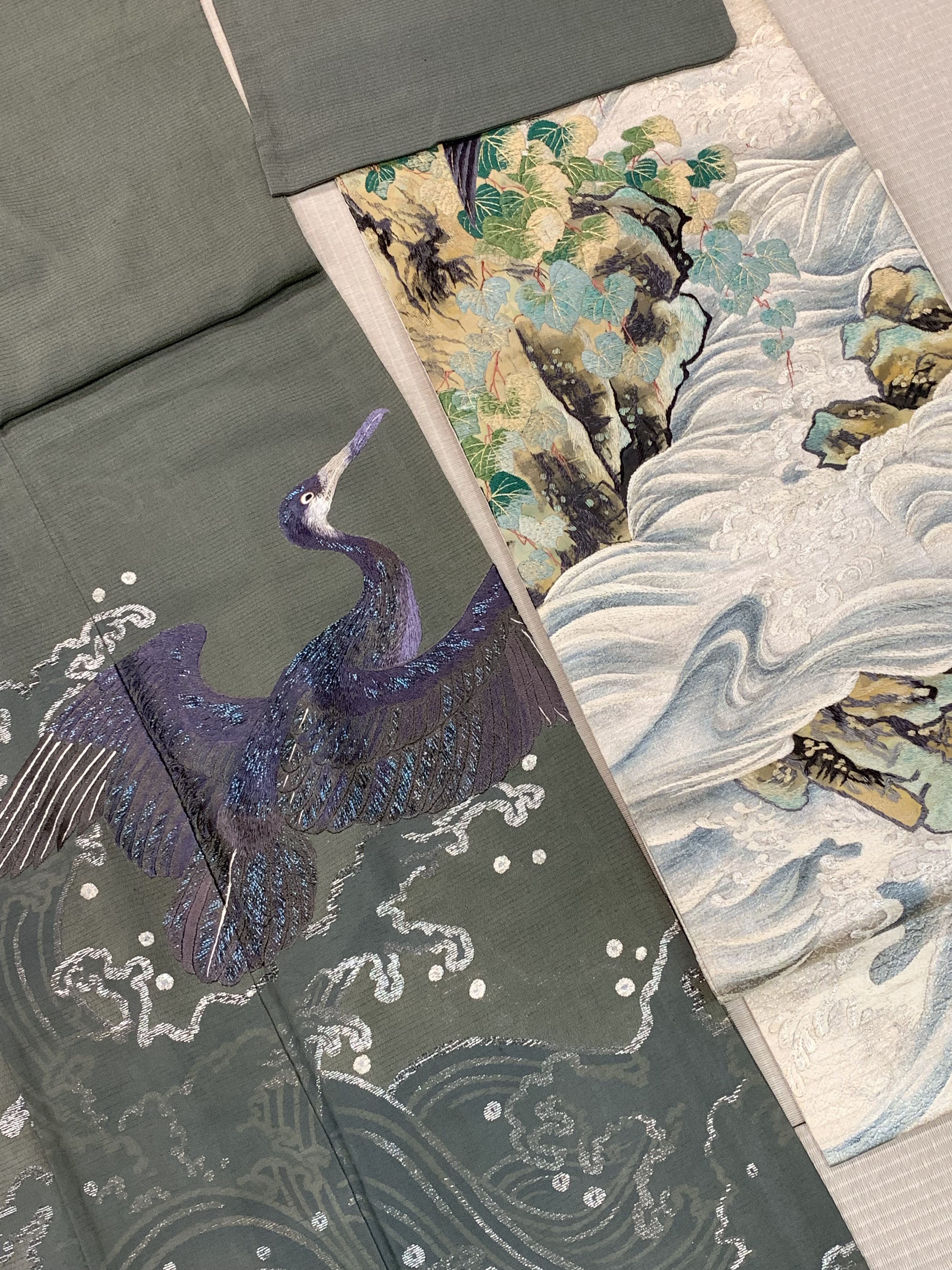 合わせた帯は、丸帯崩しの鴨の帯の片面です。