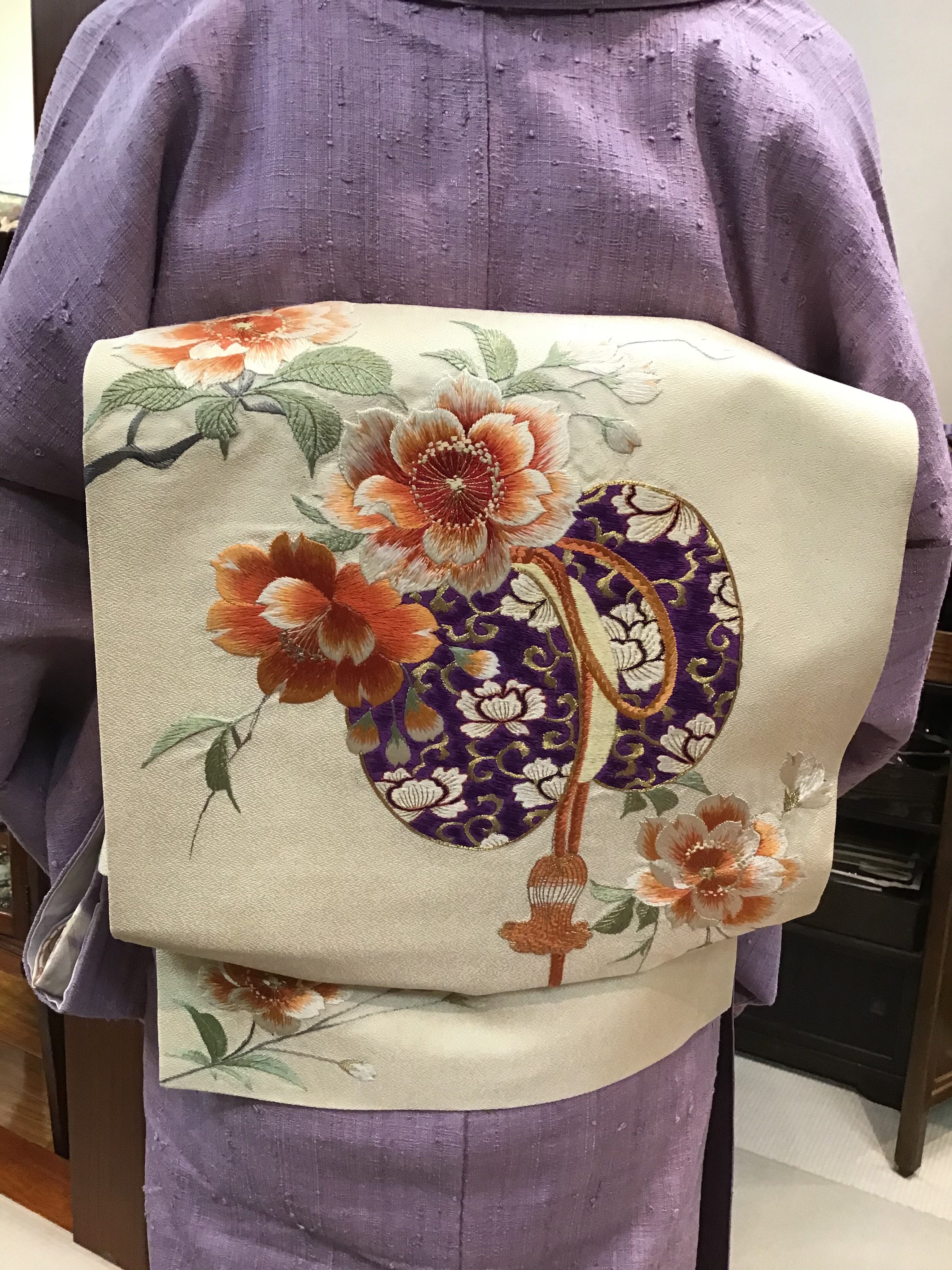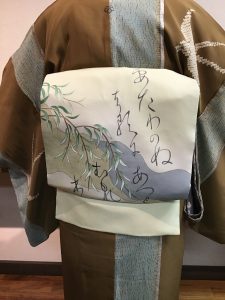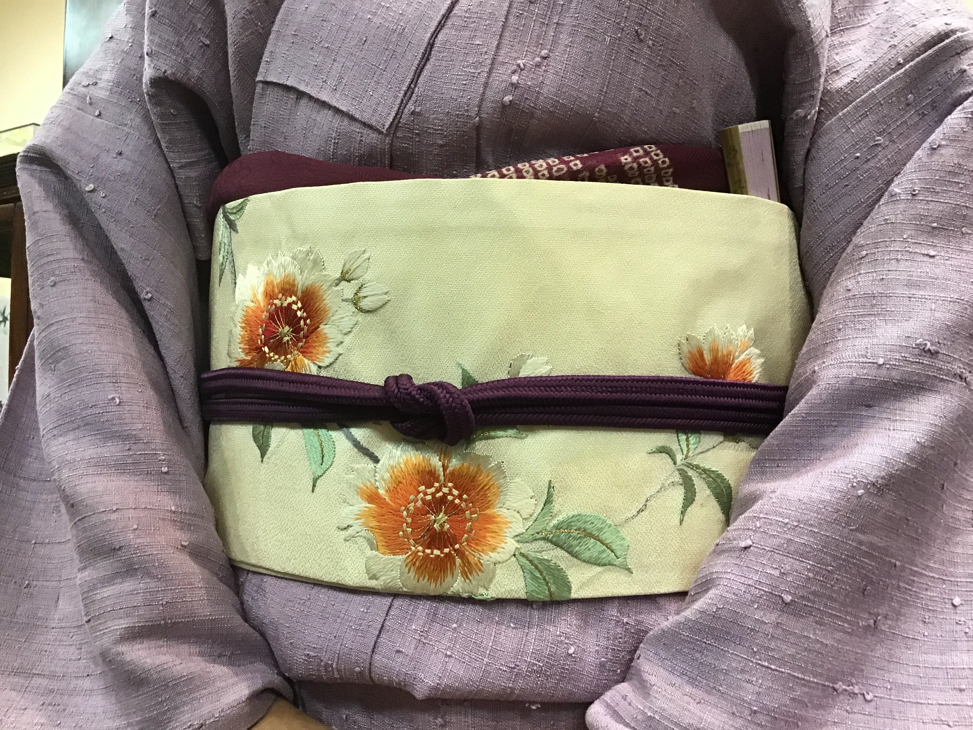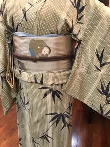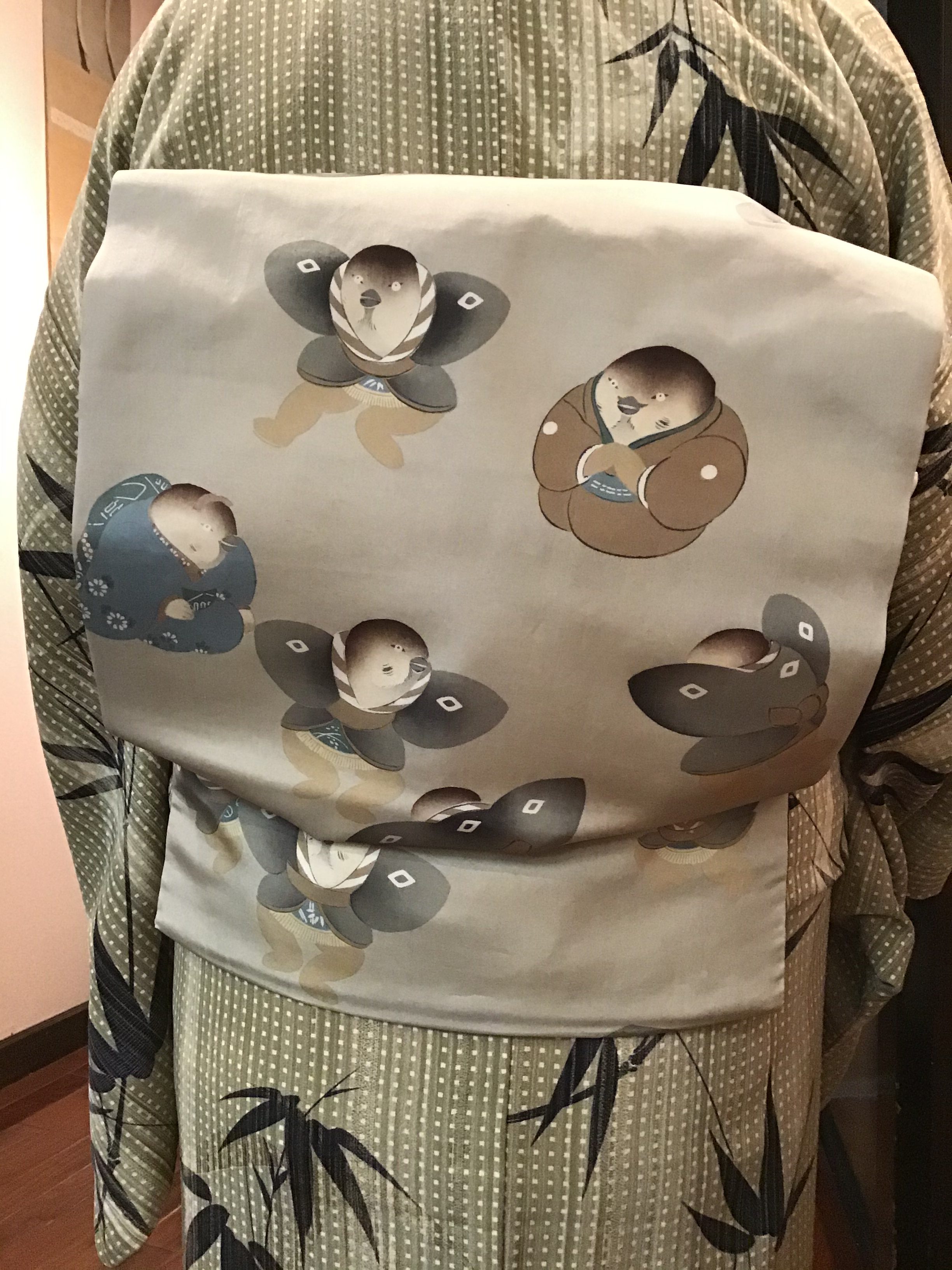 笹の小紋に雀踊の帯。楽しい装いですね♪