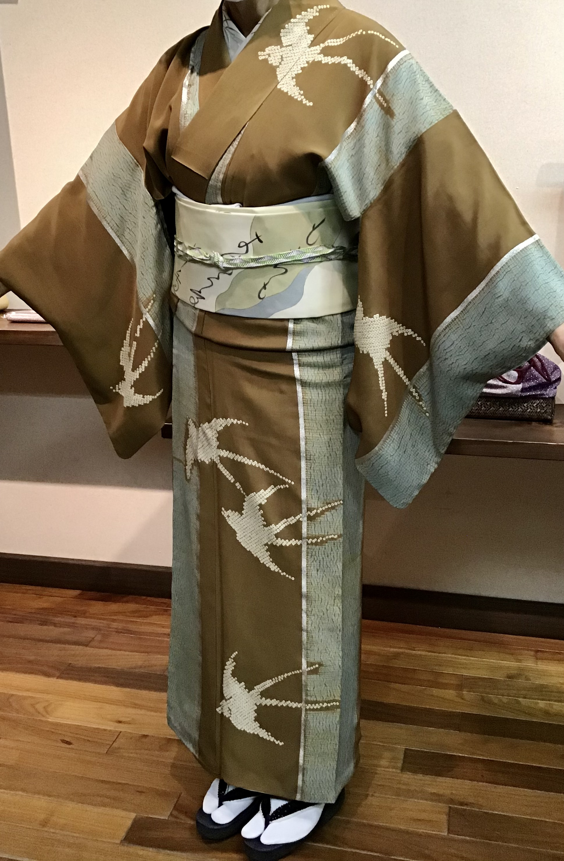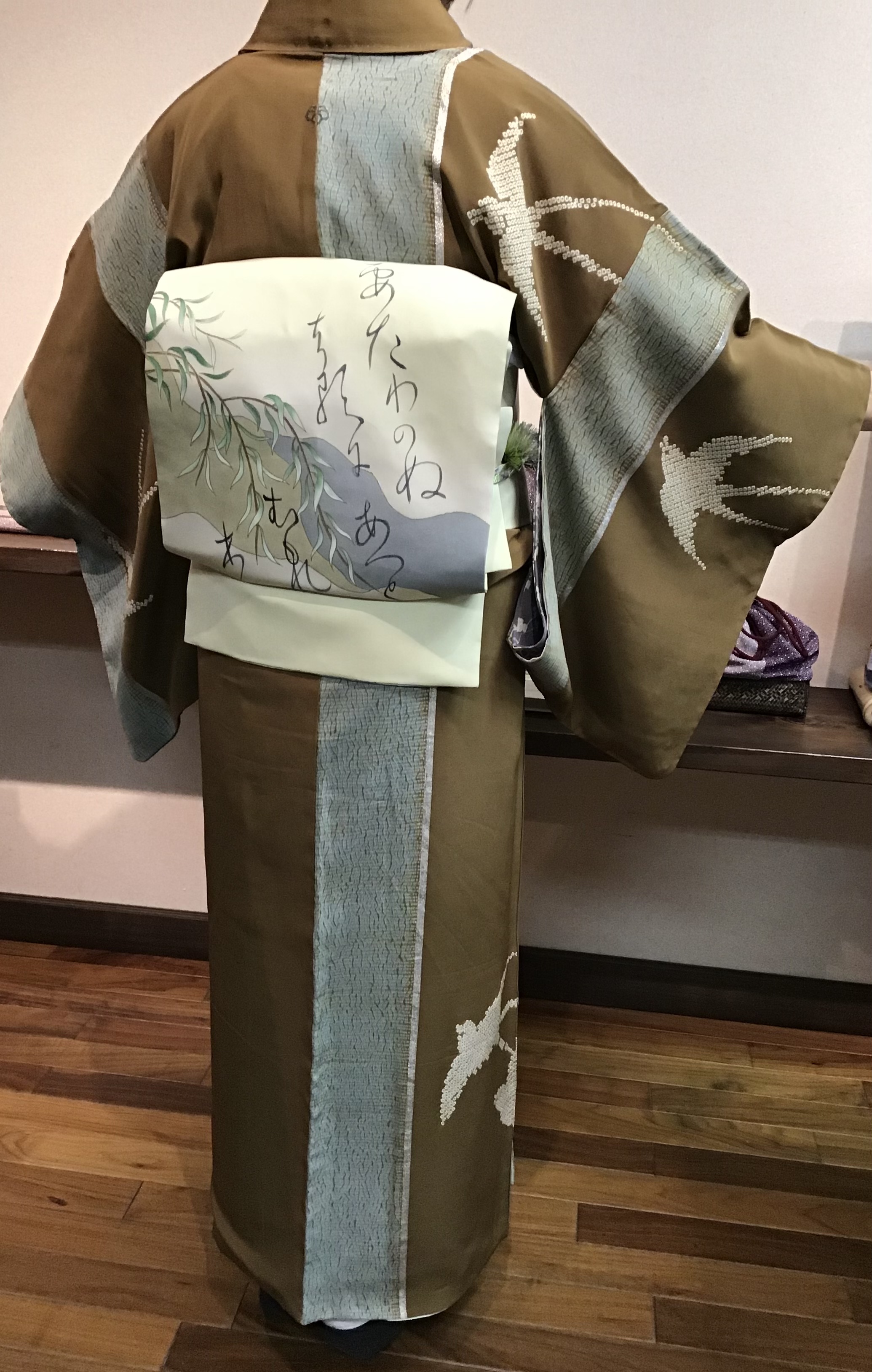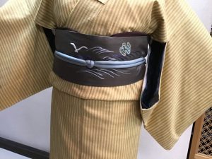 明るい縞の紬に大空を飛ぶカモメの姿、爽快です。