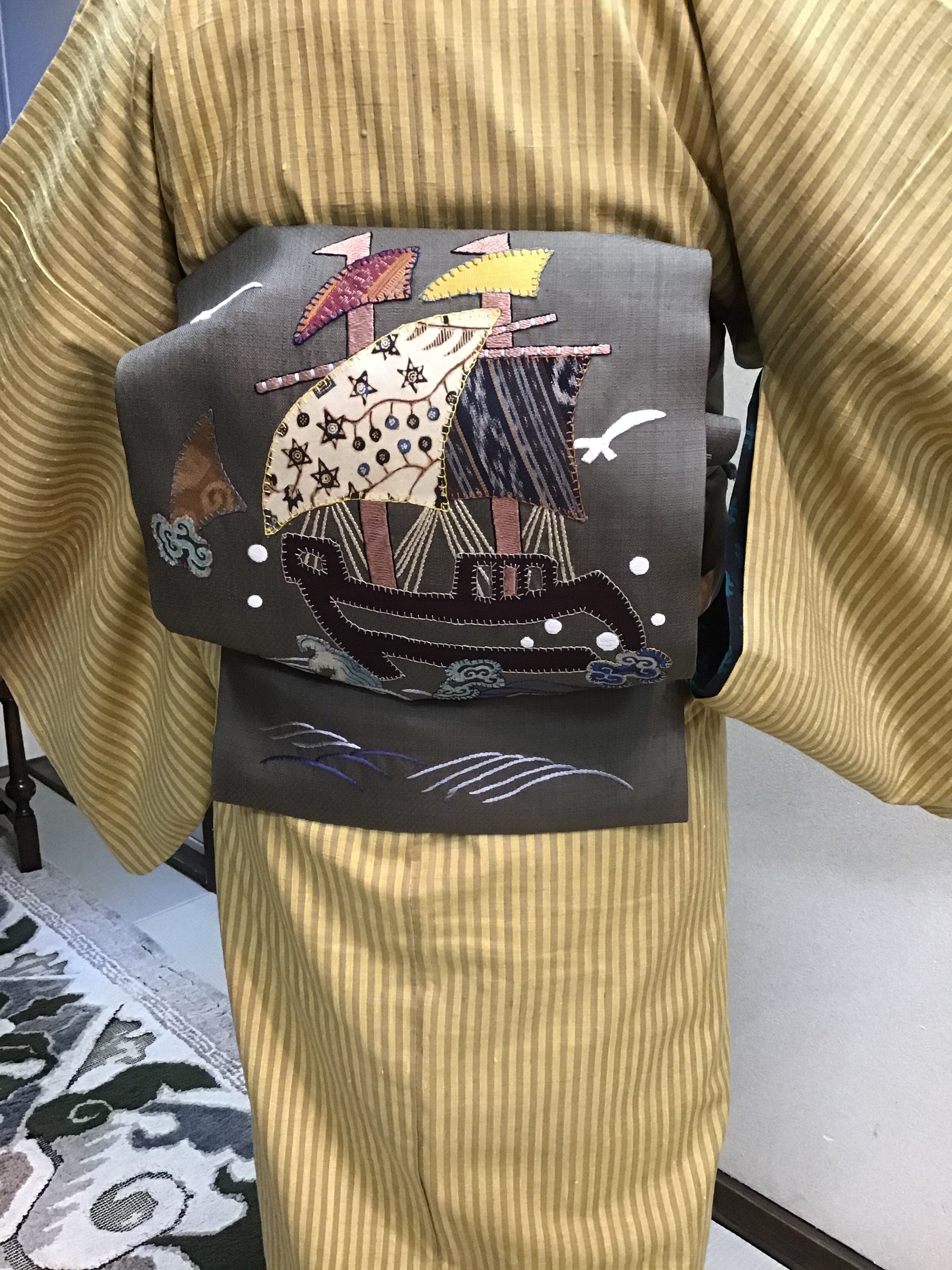外国布を帆に波しぶきをあげて進む船をコラージュした灯屋2の創作帯。