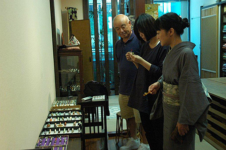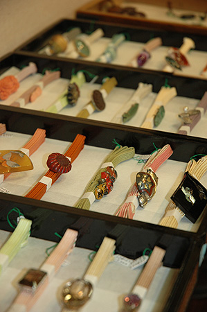 まだ開店前に並んだ帯留とかんざしを前のひととき、うれしそうな丸山さん。