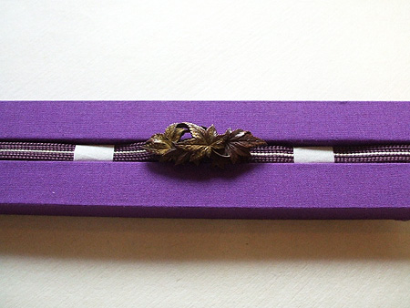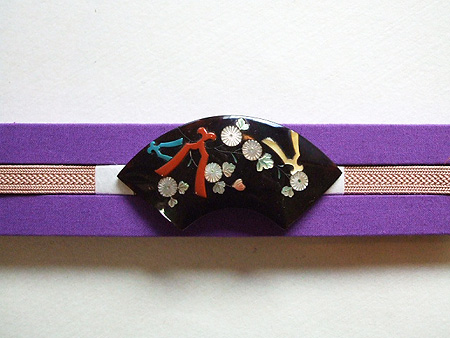 黒鼈甲の形をしたまさかりに琴路と菊が象嵌(芝山)された華やかな帯留です。