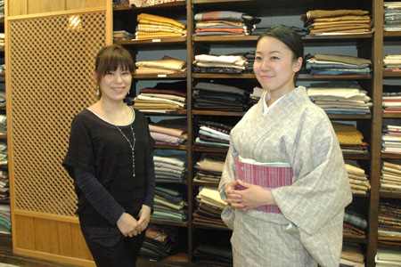 二人並んだ着物姿の松田は、以前は、レンタルフロアで着付けを担当しておりましたが、現在、銀座店にてお客様の接客をさせていただいております。