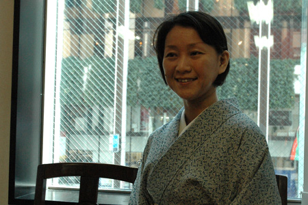 青い江戸小紋の根本容子は、灯屋2の和裁士募集に希望して来た所を銀座店でスカウト、毎日ではありませんが、現在、接客を担当させていただいております。