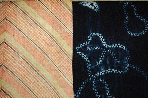 画像は、ラハリアと呼ばれる絞り染ターバン(インド)・木綿藍絞り染(日本)