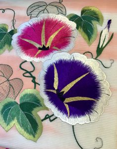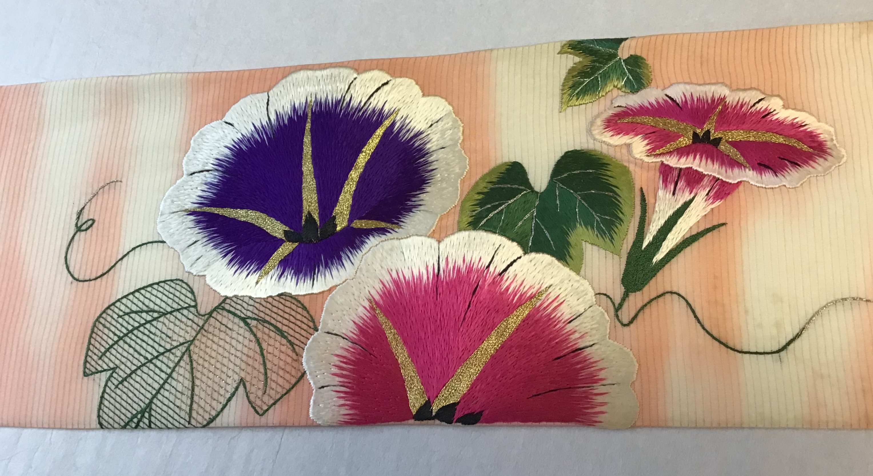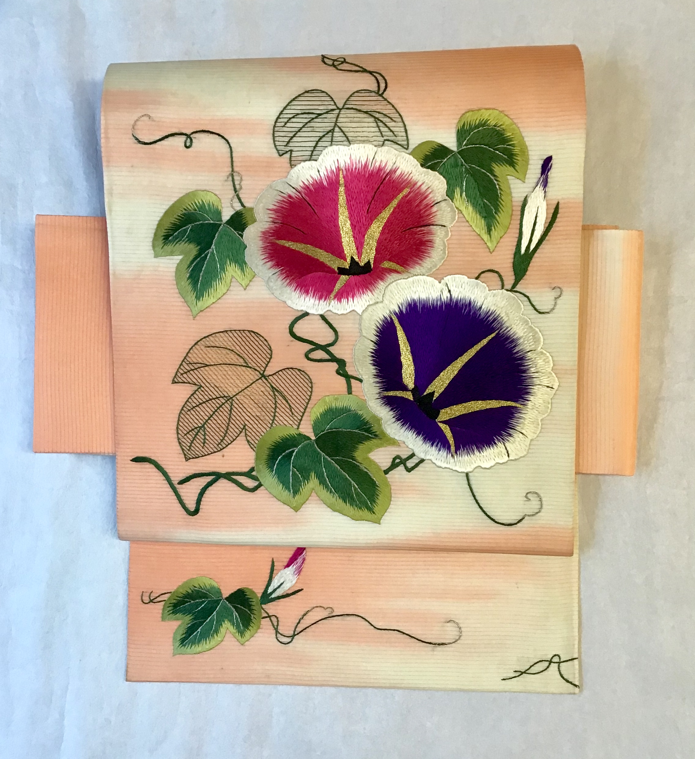 独特な形をした葉に紫とピンクの明るい色のポッテリとした刺繍が、可愛らしい名古屋帯です。