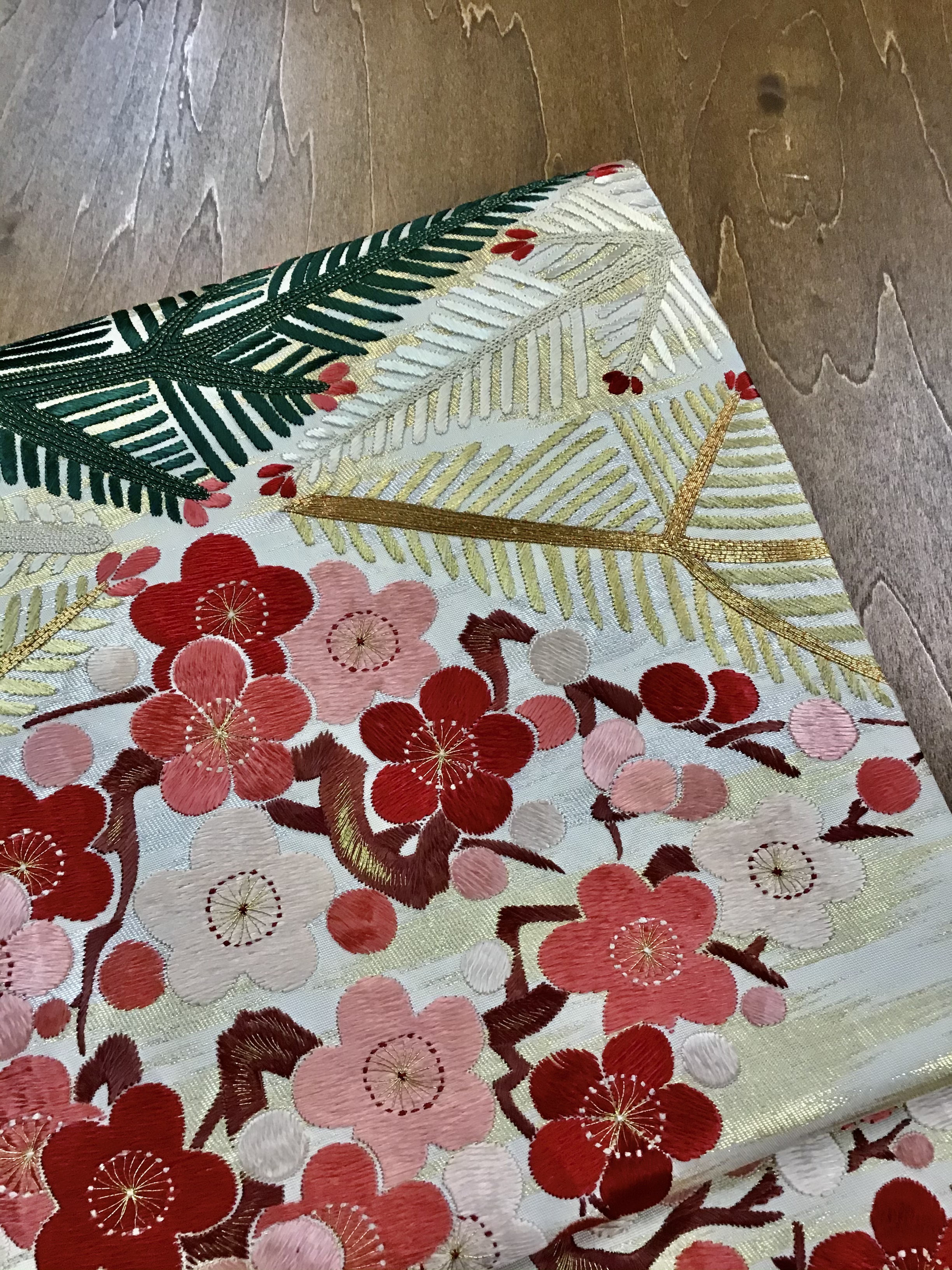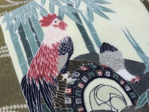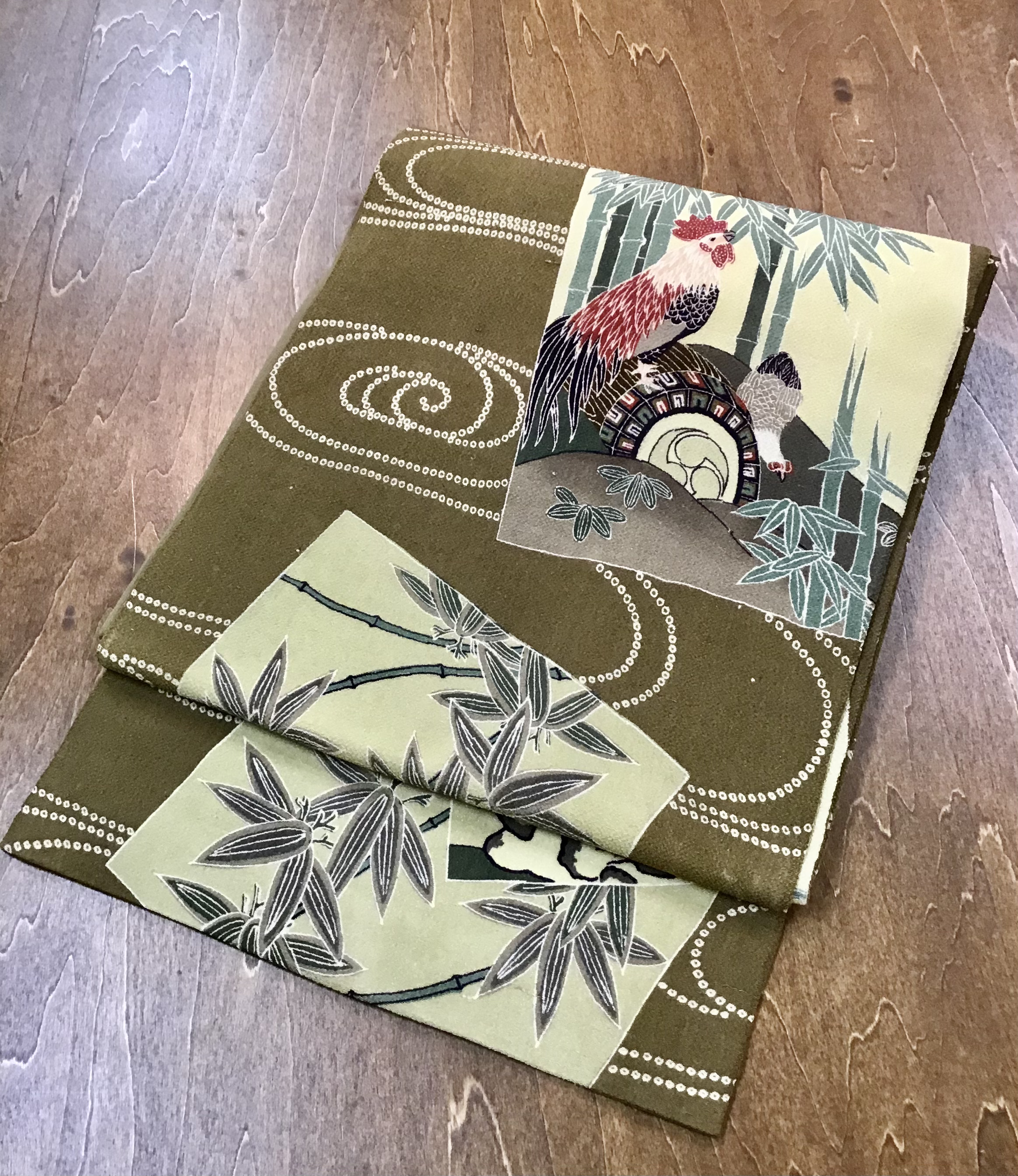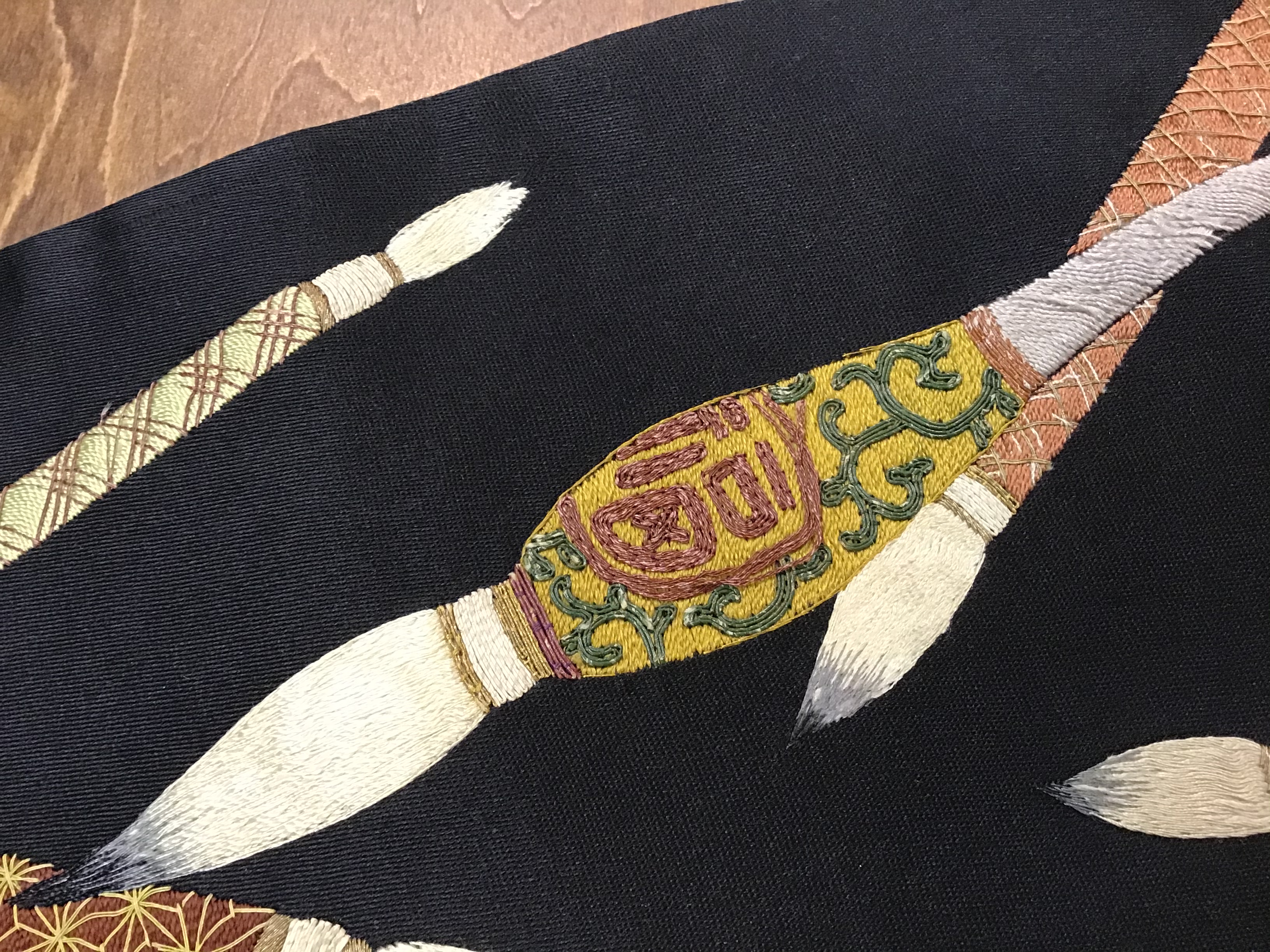 新入荷の帯とお正月向け帯のご紹介! 浦野展も終わりゆったりした空気の中、灯屋2では新しい帯も続々と入荷です。 縁起良さげな福の文字が入った筆が踊っています。 色とりどりの刺繍で描かれている筆達。 少し細めの7寸7分 筆の刺繍名古屋帯 色紙の中、竹藪の愛らしい鶏夫妻。胴前は牡丹に水鳥でしょうか。 流水紋様に色紙散らし名古屋帯 45,000円+税 お正月にぴったりのおめでたい豪華な刺繍が目を引きます。 若松菱文様と紅白梅の刺繍名古屋帯 75,000円+税