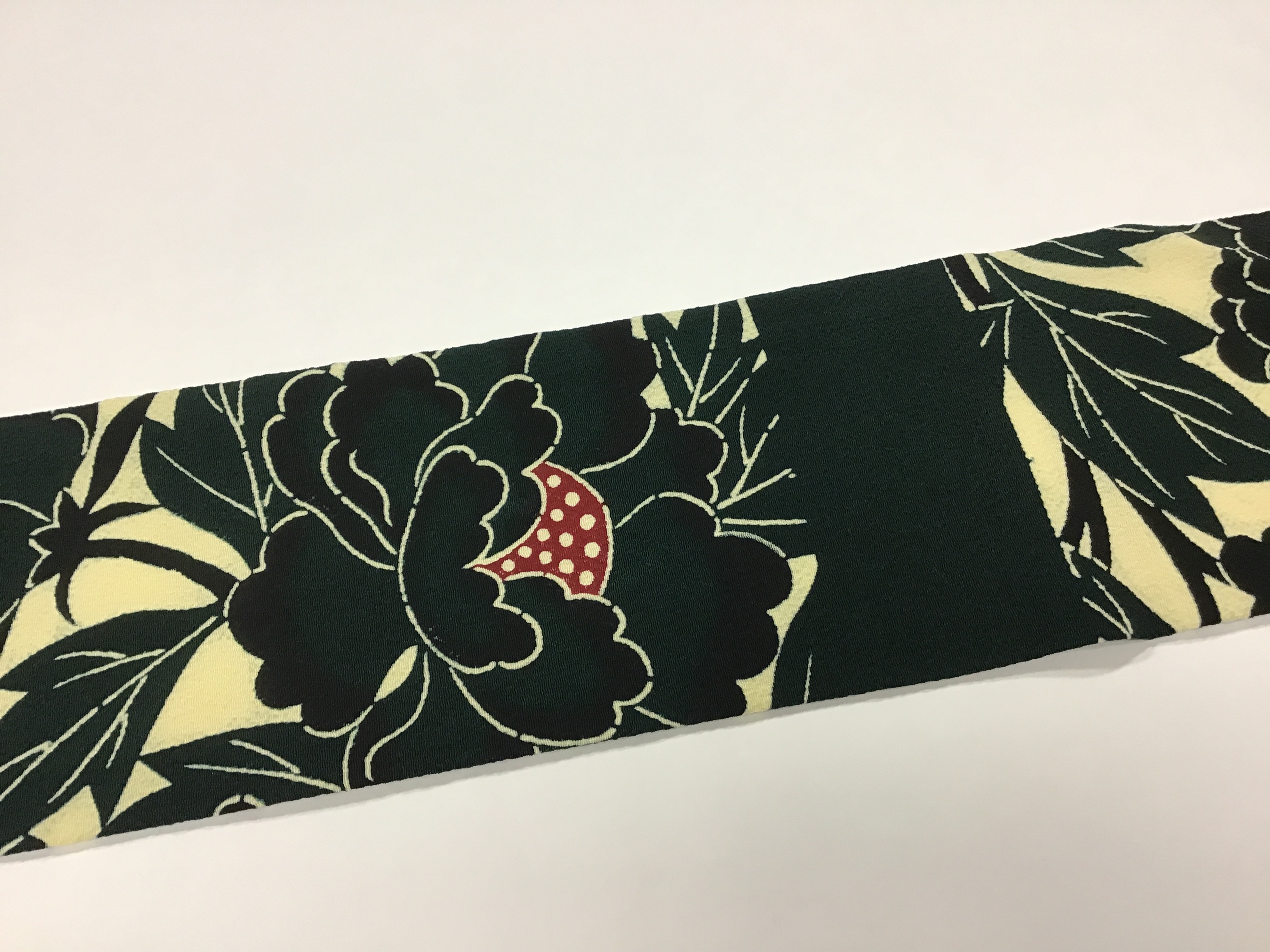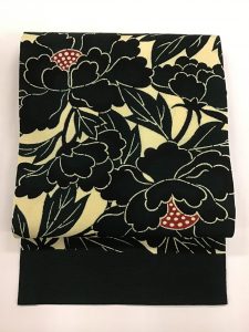 浦野の牡丹染め名古屋帯 朝晩は、冷え込むようになってまいりました。 すっきりと美しい大輪の牡丹。 元々、帯地ではありませんでしたが、帯にお仕立てしたら、素敵な染め帯になるだろう!と想像以上に存在感のある美しい染の名古屋帯が、出来上がりました。 深い緑の無地部分が、また魅力的。 たっぷりとした、浦野の特徴的な縮緬のモダンな名古屋帯です。 浦野染織工房染め名古屋帯