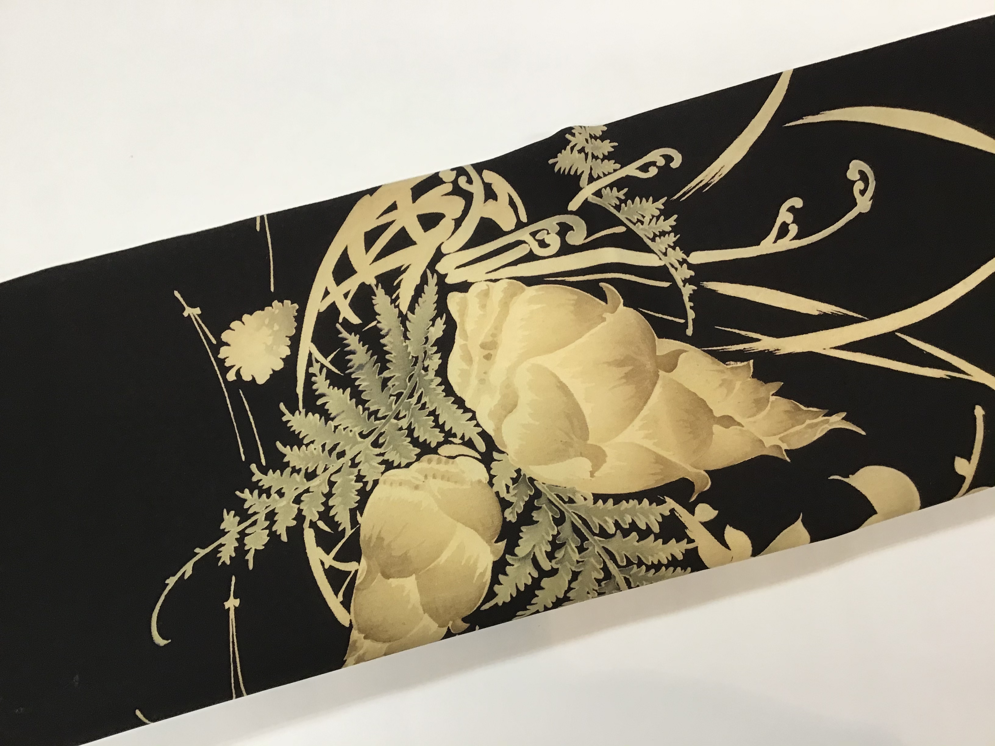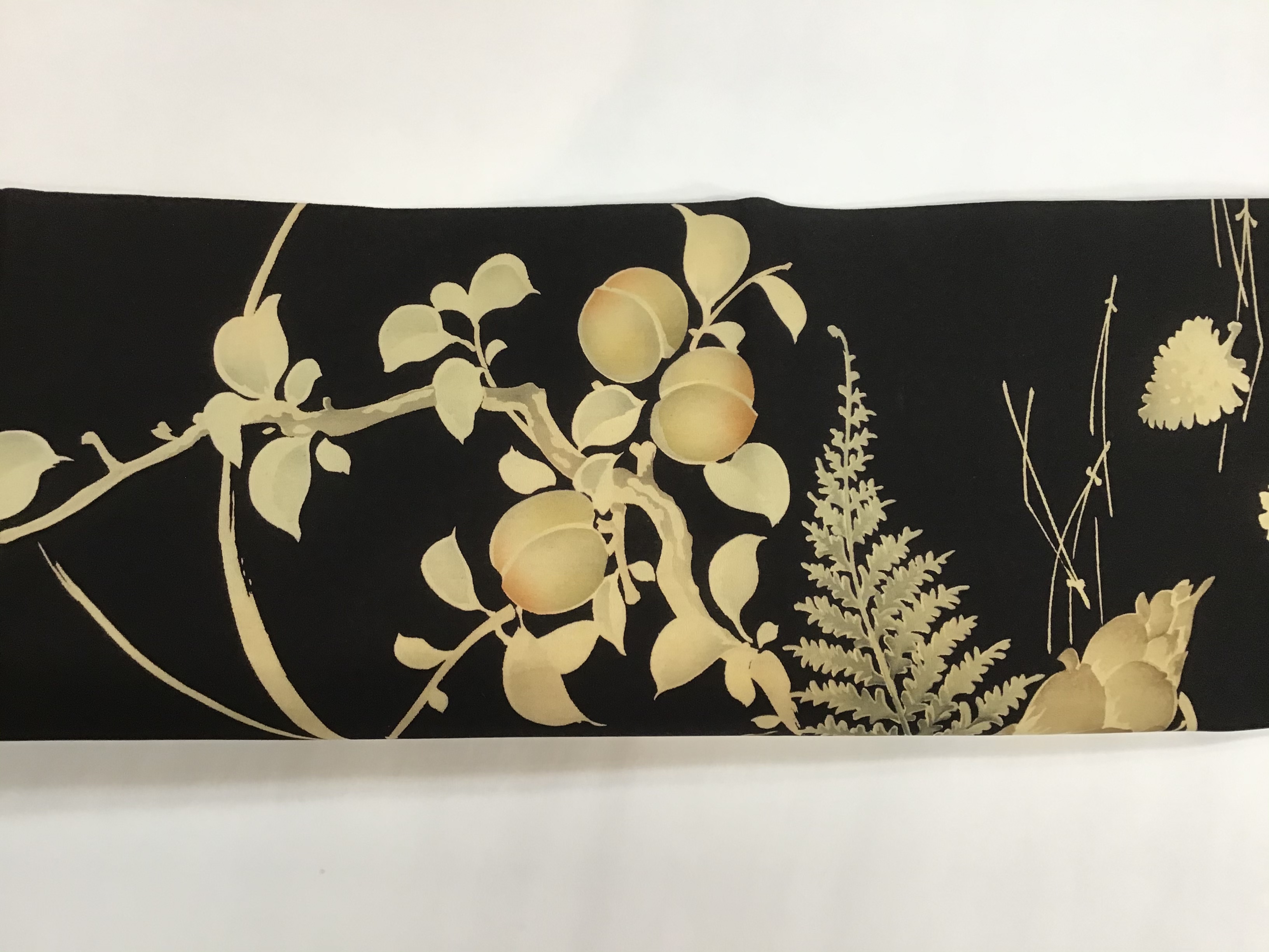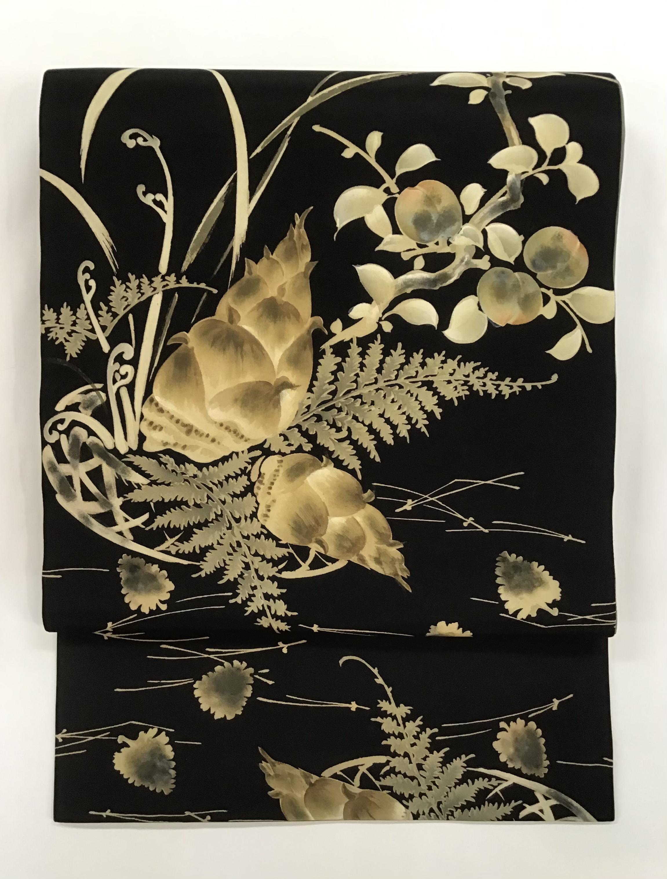 かぐわしき筍の帯 皆様、今年の筍はもう味わいましたか? 掘りたてのかわいらしく美しい姿。 自然の恵みをそのままとどめた名古屋帯のご紹介です。 松葉、シダ、ワラビ、丸いのは青梅でしょうか。 黒生地に豊かに配分良く描かれています。 松葉仕立てになっているので、前柄も自由に、たっぷりの巾でどうぞ。 この季節ならではの喜びが、またひとつ増えました。 筍の松葉仕立て名古屋帯 税込価格44,000円
