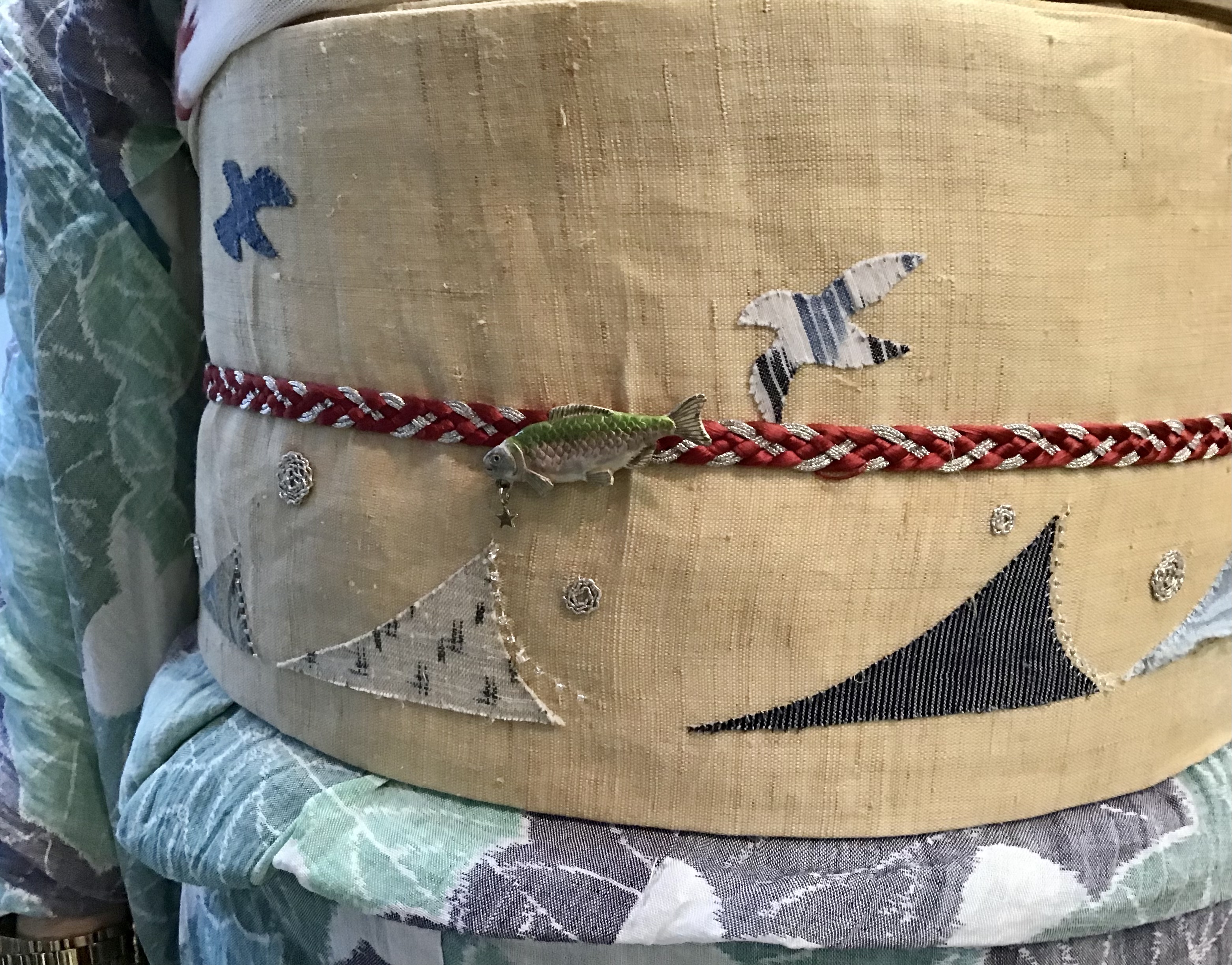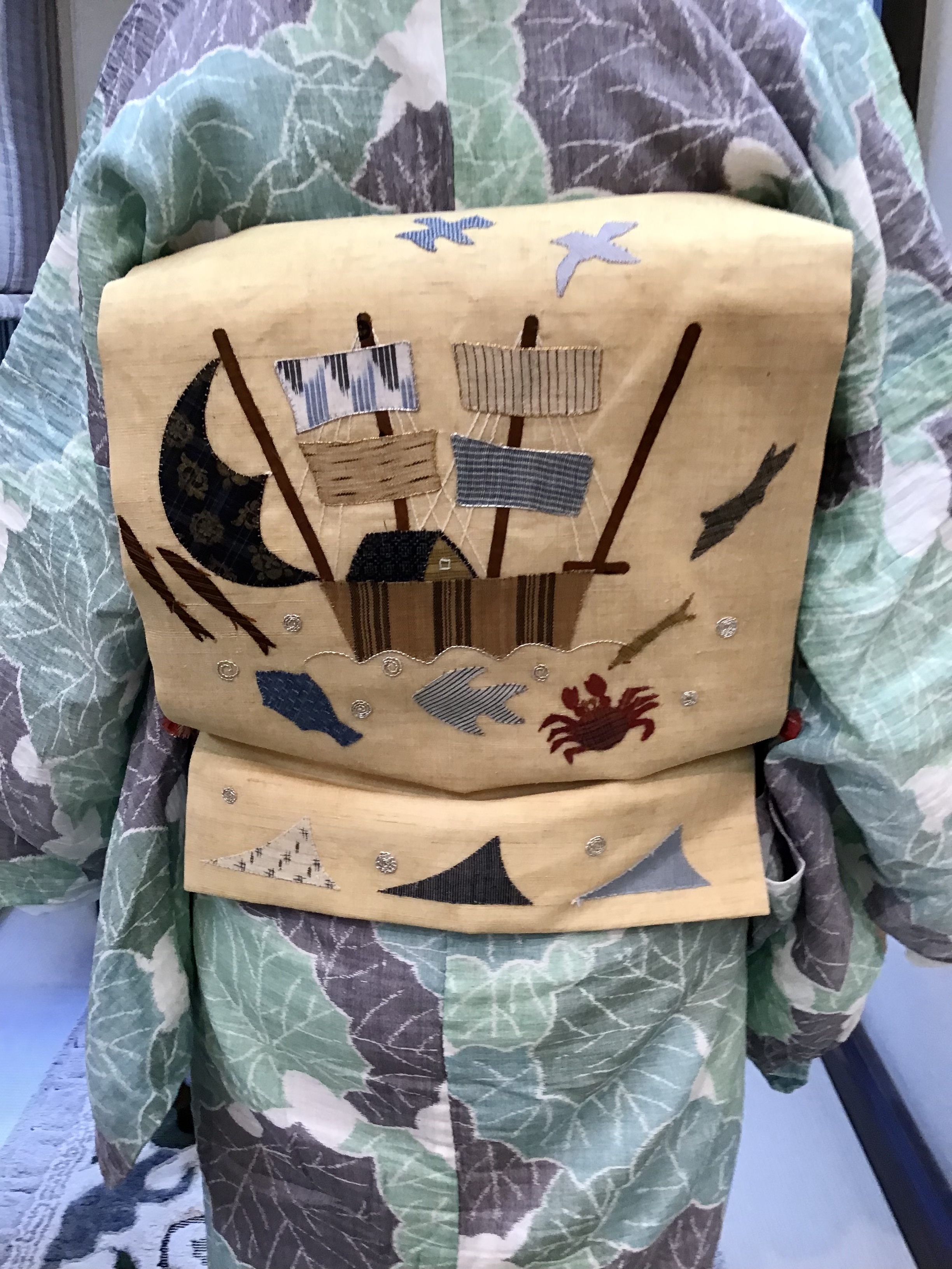 お客様の装い✨灯屋2コラージュ帯 古布で帆船と海と空の仲間たちをコラージュした帯です。 メロディーまで、聞こえてきそうな愉しさですね。 お召しになられたお客様の背中でコラージュも輝いてます。 お気に入りの装いは、自らのハートをよろこばせてくれる大切な事だと、世界の平和にもつながるといつも思います。