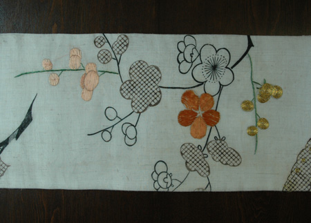 牡丹や梅の花と向い蝶の文様が染めと刺繍をされています。