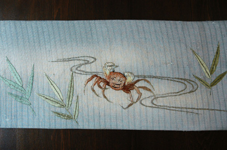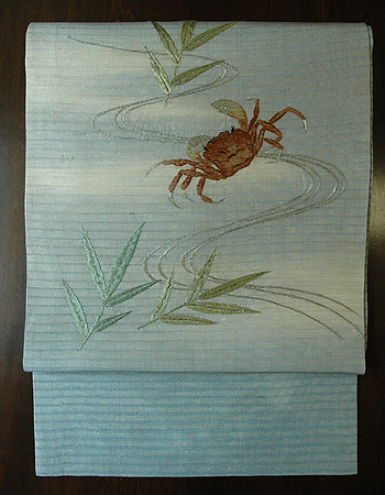 銀糸の入った絽を薄藍のぼかしに染め、笹と流水と蟹が刺繍されています。