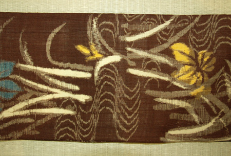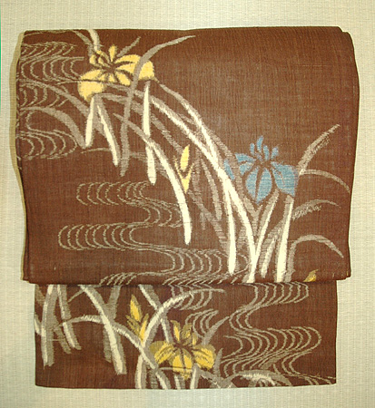 こっくりとした茶色の地に流水とかきつばたが織り出されています。