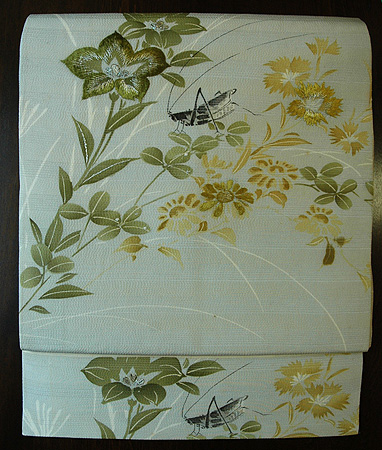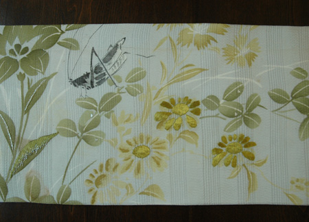 ライトグレーの変り絽目の地に秋草とキリギリスが染められ、ところどころに刺繍がほどこされています。