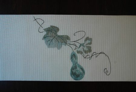 鈴虫が瓢箪に乗ろうとしている姿を細い黒糸で繊細に表現されています。