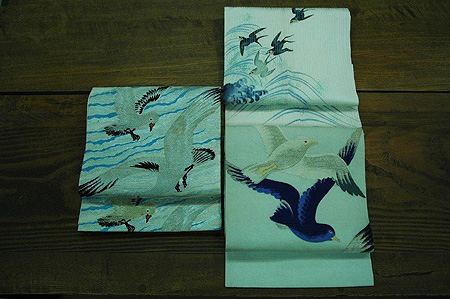 いつもの町並にいる鳥達は小さな子が多いですが、海沿いにはその広さに負けない程に大きな翼を持つ海鳥も多く、ご紹介の帯はその迫力を感じる絵柄となっております。