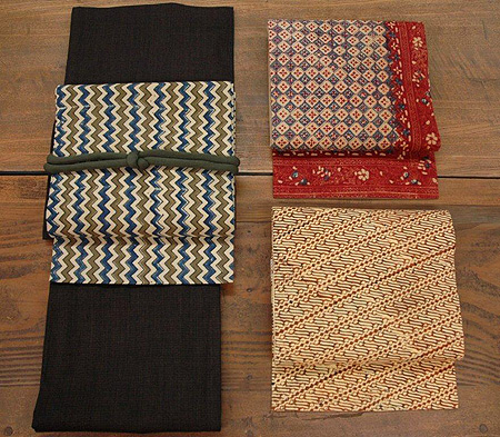 きものに合わせた帯はインド木綿の生地を、右側の2本はインドネシアのジャワ更紗のバティックを名古屋帯に仕立てました。