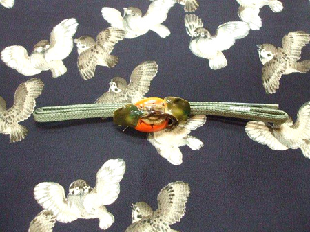 ・群れ雀の図 染名古屋帯 54600円・柿帯留め 陶器 18900円