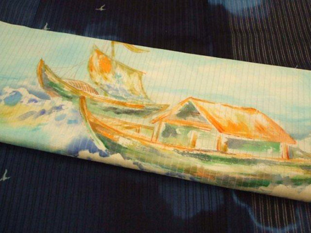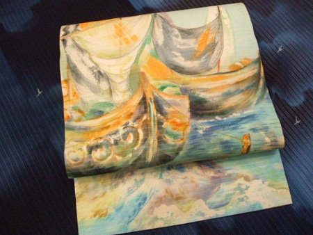 こちらは、ヨットの風景模様の絽の開き名古屋帯です。