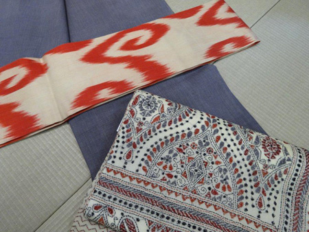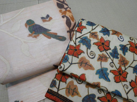 ちょうど季節がうつりかわるこの時期、単衣に合わせる帯に悩まれる方も多いかと思いますが、今回、初夏の陽射しに涼しげな、インドサリーや絹地に刺子をしたインドのフルカリなど、薄手の透ける素材のものを、色とりどり、仕入れて参りました。