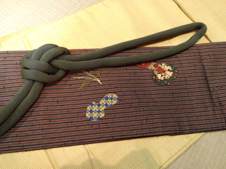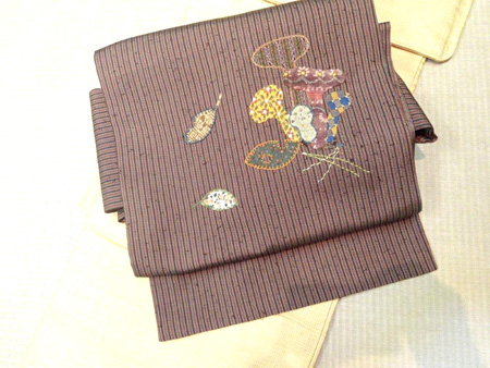紫と赤の縞が入ったひげ紬の地は、着尺だったもの。