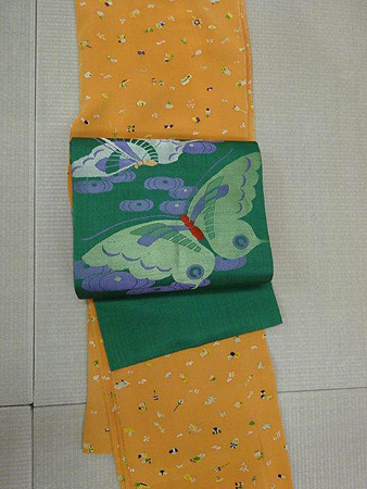 大きく蝶々が織りだされて、鮮やかなめいっぱいの緑色が際立つ帯はコーディネートのアクセントに。