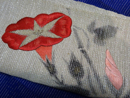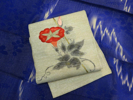 赤い朝顔 コメントを残す 店内ではひと足早く、夏の気配を感じていただいております。 赤く花開いた朝顔が、とても印象的。 麻の羅織で横糸には銀糸が織り込まれており、生成りの地に華やかな輝きを生みだしています。 素朴なのに、その輝きによってぐっとお洒落な雰囲気になる、素敵な帯です。 織りや意匠に、ひと味もふた味も違った創意工夫がされた、さまざまな布たちを、ぜひご覧にいらして下さい。 朝顔刺繍羅開き名古屋帯 64000円 松田
