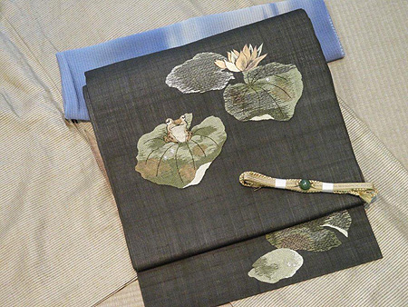 蛙と蓮刺繍帯に翡翠玉帯留夏の始まりです。美しい新緑の季節、日増しに強くなる陽射しを浴びながら外出するのも楽しい時です。