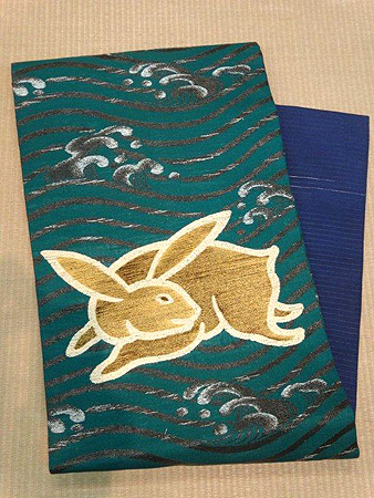 因幡の白うさぎでしょうか、青緑色の波の上で大きくあらわされた兎です。