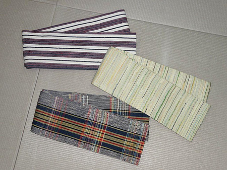 写真の帯は浦野理一の帯地やインテリアファブリックを半巾に仕立てた帯。どの生地も浦野理一らしいざっくりした糸味と大胆な配色です。