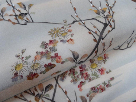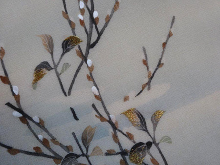 霞たなびくうすいグレー地の縮緬に、猫柳と野菊、空には瑞鳥。