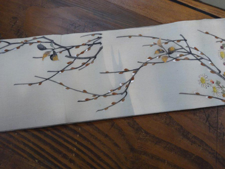 柔らかな花穂は小さくふっくらとした刺繍、野菊の葉は美しい色あいに染められ、金糸の縫いとりがところどころにきらめいています。