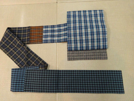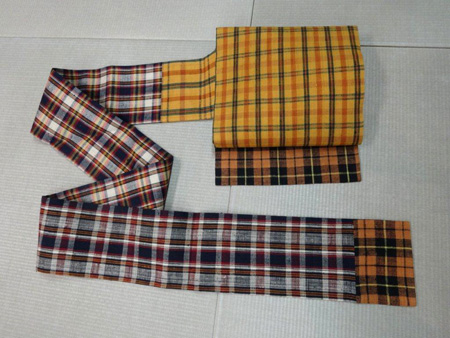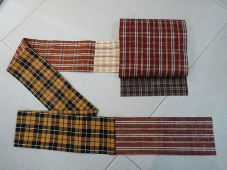 切継ぎの名古屋帯 今回の展示会では、灯屋2の得意技でもある、切継ぎの創作もご用意しております。 こちらは、浦野の布を何色か組み合わせて、味わいのある一本の帯を作りました。 HPでご紹介していない物も、沢山ございます。 どれも素敵で、全て写真でお見せしたいのですが、数が多いので・・・ 是非足をお運びになって、ご覧下さいませ。 切継ぎ名古屋帯 黄色格子のお太鼓柄 青色格子のお太鼓柄 赤色格子のお太鼓柄 どれも 237,600円 海老沢
