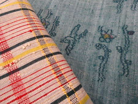 経に緑、緯に白い糸を使い、優しい色合いに織り上がっていて、顔映りを明るく見せてくれる鮮やかさを持っています。