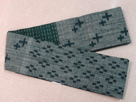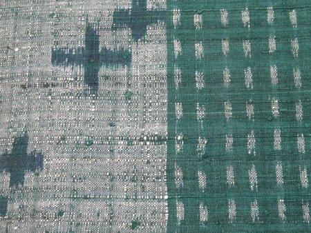 濃緑と生成りで幾何柄の絣を織りだしています。単純な霜降柄や十字柄でありながら、繰り返しによって楽しいリズムがでています。