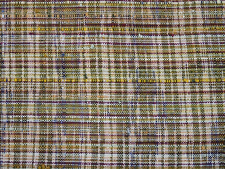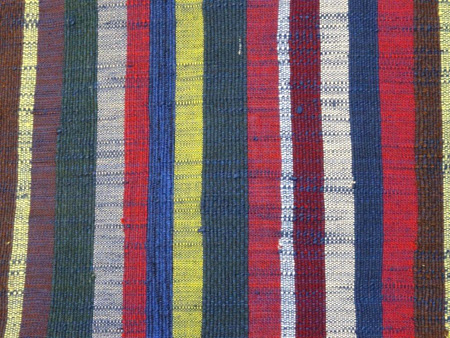 経糸には何色もの色糸を遣い、横糸は生成と濃灰色を使っています。