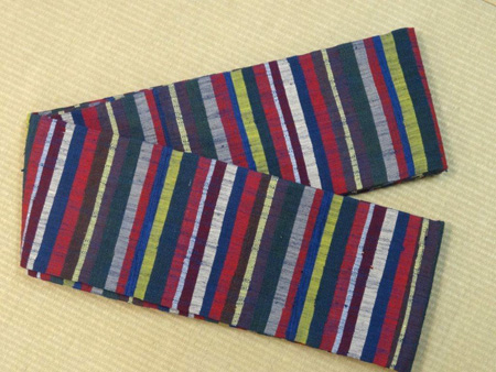多色使いの横段柄に経糸の青が全体にかかった帯。