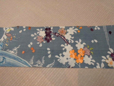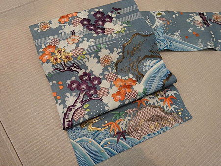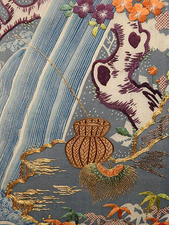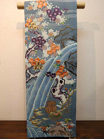桜満開の江戸裂 満開の桜に太く流れ落ちる滝。 豪快で勢いある構図の中、魚籠(びく)の傍らから、滝に向かって竿から細く細く垂れる一本の糸の刺繍が繊細で、その対比がリアルな臨場感を醸し出しています。 魚籠の脇には隠れ蓑。 隠れ蓑は、鬼や天狗の持ち物。 静かな山谷の現世をはなれた美しい風景が胸を打つ、小袖よりお仕立てした刺繍帯です。 桜滝模様江戸裂縮緬名古屋帯 302400円