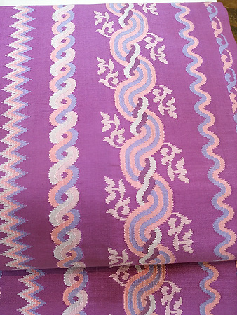ルンタヤ模様名古屋帯 ミャンマー中部の王族女性のために、綴れ織りされた連続する波模様。 かつての宮廷衣装の代表的な図柄でもある、ルンタヤ模様です。 可愛らしいラズベリーピンクに曲線が、美しい! 軽やかに春一番を告げる名古屋帯です。 ルンタヤ模様名古屋帯 97200円