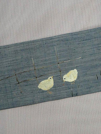 お太鼓には親鳥と戯れる2羽のひよこが愛らしく、前には餌をついばむ無垢なひよこが刺繍されています。