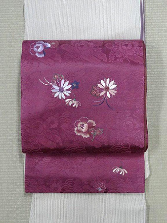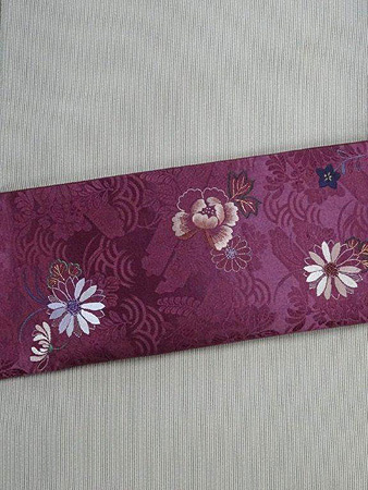 独特の臙脂色の繻子に、花筏と青海波が織り込まれた帯。