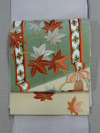 丁子色地にたっぷりの紅葉と金糸が刺繍された雅な雰囲気の帯。