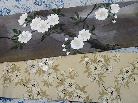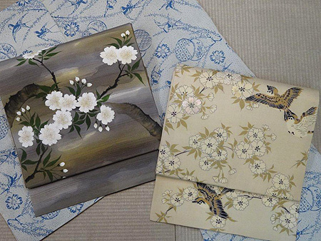 もう一本の帯は、華やかな八重桜に雀が戯れている染帯。