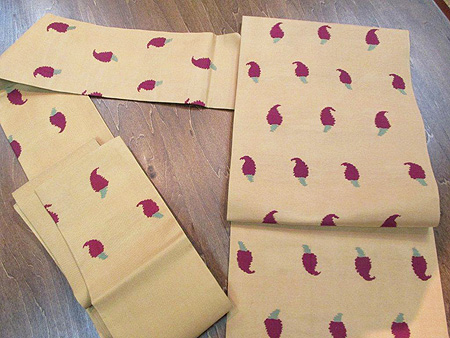 新入荷の帯 本日入荷した、お手頃価格の可愛らしい帯です! 取り急ぎご案内いたします。 早いもの勝ちです、どうかご容赦ください。 トウガラシが一面に織られた名古屋帯 32,400円 縮緬地小鳥と木の葉染名古屋帯 37,800円 海老沢