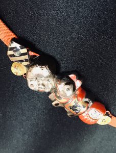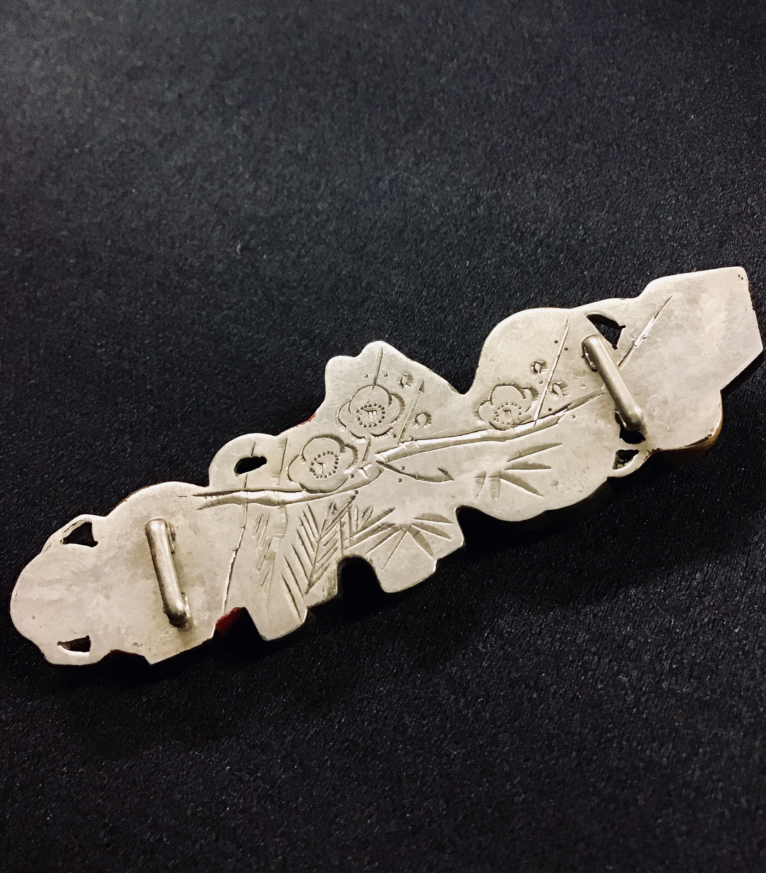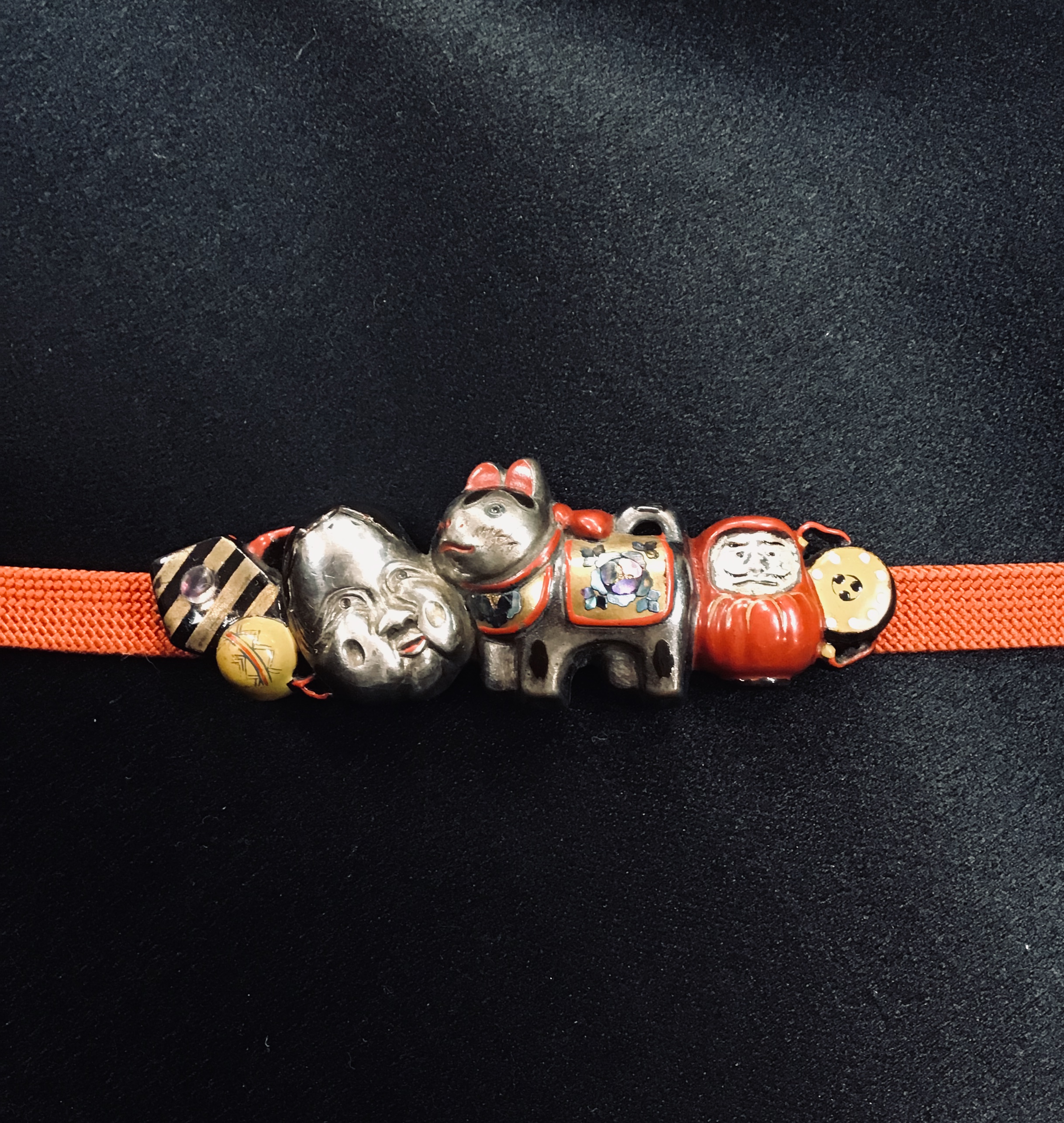 玩具づくしの帯留め 凝った帯留めが入荷しました! でんでん太鼓に達磨、犬張り子、お多福と玩具が並んだ玩具づくしの帯留めです。 螺鈿で細かな細工が施され、裏にあてた金具にも梅の彫りが入っています。 玩具づくしに梅なのでお正月に着けるのがぴったりですが、これだけ人気者が並んでいますので、節句の時やお子様の記念日に着けるのも楽しいです。 玩具づくしの帯留め ご商談中