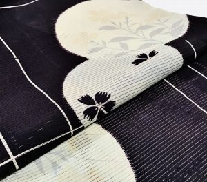 黒地にぼんやり浮かぶ様子が絞り風に丁寧に表現されて、夏の風情が美しい小紋です。